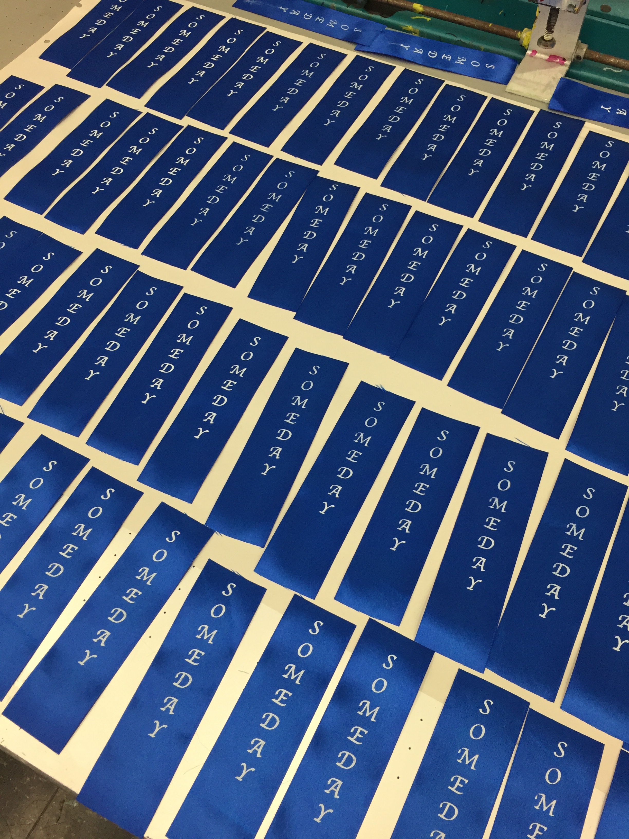 - Someday, screenprint on blue satin ribbon, 2" wide